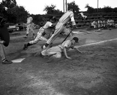 Image shows a baseball game between Paschal and Arlington Heights. Left to right, Arlington Heights Catcher Robert Howington, Wayne Goodwell and Phillip Kendall. Kendall is shown sliding to base while Robert Howington lunges for ball. Goodwell is shown evading both Howington and Kendall. Two unidentified players on left . Published in the Fort Worth Star-Telegram morning edition, July 4, 1950.