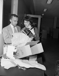 Star-Telegram senior sports columnist, Phil Colier took the plunge to wed Miss Dorothyann Duncan, daughter of Mrs. Joseph Kauffman of Fort Smith, Arkansas last February 25. Phil and Dorothyanne are shown receiving the Editorial Department gift to them, a Mirro-Matic Pressure Cooker and a wall can-opener. Phil's co-workers in the sports department helped them set up housekeeping with a floor lamp and an electric iron.