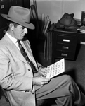 Stewart Sewell, a Jacksboro Angus breeder, is shown sitting, looking at a calendar. Published in the November edition of the Fort Worth Star-Telegram's Ranch and Farm News, 1951.