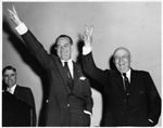 Lyndon Johnson (left) and Sam Rayburn raise hands in a victory sign.