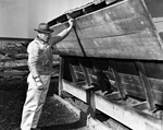 Image shows J. L. Brooks by a self-feeder. The self-feeder is connected to a feed mill by a blower, eliminating troublesome handling. Published in the Fort Worth Star-Telegram March 1951.