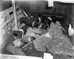 Image shows a group of Hampshire hogs at J. L. Brooks farm. There is one chicken to the right of the hogs. Brooks slaughters two every year for home use and sells the rest. Published in the Fort Worth Star-Telegram March 1951.