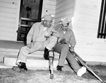 Writer George Sessions Perry, left, talks with a friend and adviser, Mike Lee, who ranches near the Rockdale author's home. They are looking at a branding iron made especially for a Hereford bull, "San Jacinto Sam," and progeny.