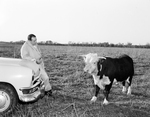 Perry has a few words with San Jacinto Sam on the Mike Lee Ranch. Sam, a tractable bull, listens with quiet attentiveness.
