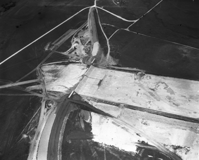 The slot-type concrete spillway of Benbrook Dam is shown as it appears from the air at the extreme northeast portion of the giant earth dam embankment. (1) Points to the unique seven-foot deep and 100-foot wide slot in the spillway crest which is designed to release flood waters from the lake for a 35,000 foot per second capacity discharge in the channel immediately below the structure. (2) Shows where the water will be impounded behind the dam. (3-4) Designate the tie-ins to the earth embankment, and (5) shows the spillway channel that will carry flood waters about 1 and 1/2 miles into the Trinity Clear Fork channel. The overall spillway structure, designed to discharge water only at the slot during flood conditions of past record, is 500 feet wide. Published in the Fort Worth Star-Telegram evening edition, July 10, 1950.