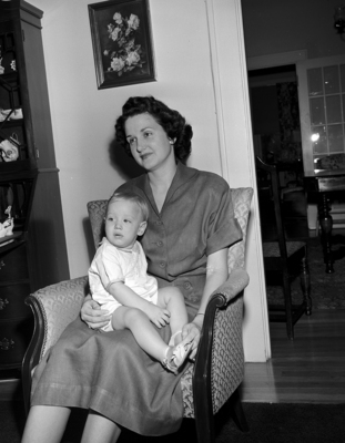 Image shows Mrs. Howard E. Taylor and son Grady Edward in living room. Both have returned to their home in Houston with Mr. Taylor after visiting their parents, Mr. and Mrs. Edward W. Taylor, 2434 Wabash and Mrs. O. L. Ellis, 608 W. Fourth St.