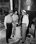 Alfred, left, and M. D. Lindemann, right, of Cost, fed the nation's first commercial house of broilers using feed with antibiotic supplement. Checking their feed, center, is J. R. Reed superintendent of the Gonzales experiment station, who did research on the ration.