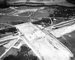 An aerial view of the 500-foot reinforced concrete spillway which would discharge flood water at the Grapevine Dam on Denton Creek. (1) Shows the exact spillway section, about two thirds complete, with one area at the spillway crest not yet poured and other pours bottled by curing processes. (2) Points to the top area above the spillway which will be part of the 238,200 acre-feet of water storage for flood control. (3-4) Concrete tie-ins to the dam's earth embankment are shown finished, and (5) points to the spillway channel, bordered by retaining walls near the dam, that will direct the overflow water back into the original creek channel below the dam.