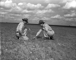 Land on the Carrell farm that was seeded to native grass last year is checked by William Bennett, soil conservation service technician, and Olleon Carrell. Published in Fort Worth Star-Telegram evening edition May 1952.