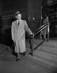 Series on Men's fashion. Suits and topcoats. Lightweight but warm enough to ward off cold winter winds is the beige sheen gabardine coat. It has notched lapels, set-in sleeves and exposed button closing. A man is modeling the coat is walking down some steps outside of a building.