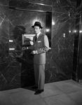 Series on Men's fashion. Suits and topcoats. A worsted gray fleece with chalk stripes is used in this suit with patch pockets and three-button front. Note the round pin-down collar and square-folded handkerchief, both top fashions. The man modeling the suit is standing next to a wall of marble.
