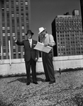Series on Men's fashion. Suits and topcoats. Two examples of fall fashion are a charcoal gray flannel and water-repellent poplin. The three-button suit has flap covered plain pockets, three-button sleeves and a center back vent. The jacket is of English poplin and weighs just nine ounces. The hat also is of the light and water-repellent fabric. The two men modeling the clothing are standing on the roof of a building with other buildings in the distance.