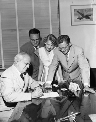 Youth revival week- Mayor Deen left, signs a proclamation designating July 10-16 as Youth Revival Week in Fort Worth, at nightly revivals in the Polytechnic Amphitheater. Witnessing the signing are, left to right, Rev. Jimmy Morgan of North Fort Worth Baptist Church, Miss Ruth Shomburger and Tom Norfleet.