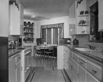 A busy room in the Hinton House is the kitchen. Wall tops are light yellow, with wainscoting in blue. Tile is yellow with blue trim, and the floor is linoleum in ivory shade. Near the dinette suite is a telephone desk.