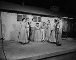 Square dancing time on the Hinton's rear terrace finds these couples swinging it out. Left to right, Mrs. Jim Bearden, Mr. Bearden, Mr. Ernest Bursey, Mrs. Hinton, Mr. Hinton, Mrs. Bursey, Mrs. John Lamkin, and Mr. Lamkin.