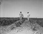From left to right, Tom Stewardson; his son, Tommy, and Bob Finlay, SCS technician, stand in combine milo planted on a terrace on the Stewardson farm.