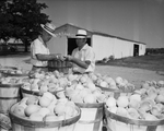 Tom Denman, station horticulturist at the West Cross Timbers Experiment Station at Stephenville, disposes of a half-bushel of the fine peaches grown by the station this year, to a buyer. Although the station does not grow peaches on a commercial basis, there is always a local demand for the crop as it ripens.