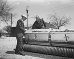 Meinard Hesse, equipment custodian, and Emmitt Yoder, SCS technician, both of Muenster, inspect a multipacket drill owned by the Upper Elm-Red Soil Conservation District.