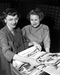 Sports Secretaries - Edna Mitchell, left, winds up eight years of service on the third floor October 15. She is shown with her successor, Hettie Arleth of 4320 Rogers, sister of Wanda Cartwright in the Payroll Department. The job is secretary to the sports department's one dozen writers and Al Panzera. Edna says she doesn't mind saying she's expecting a sister for son, Larry, about New Year's.