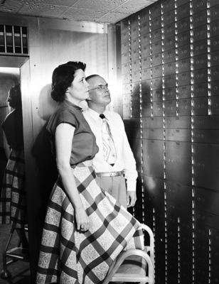 Mrs. Zettie Jeanes, bank employee, and C. H. Wilemon, president of the Arlington State Bank, check new safety deposit boxes at the Arlington bank. Mrs. Jeanes uses a step ladder to inspect the boxes.