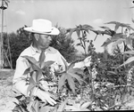 Dean checks the growth of a castor bean plant on his farm. He believes the beans may be a practical secondary crop for his area.