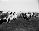 Top production from land and animals alike is the keynote of the Rigler dairy farm in Hale County. The herd is made up of Jersey and Holstein cows. In this picture a manure fertilizer spreader is being loaded for use on the Rigler pastures.