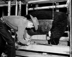 Marvin trims a calf's feet. Evenly trimmed hooves insure the animal's standing squarely on his leg's and making a better show ring appearance.