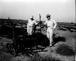 Clarence Spill, right, stock farmer near Winters, rigged this one-way disk for a pitting operation that enabled him to seed grass on old fields and get good stands even indrouthy seasons. At left is Woodrow Hoffman, SCS technician.
