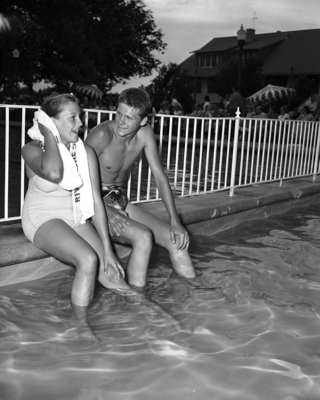 Peggy Clay tells Ray Evans how she won the 50-yard free-style at River Crest. Ray also won the 50-yard free-style for boys at the city meet sponsored by the Recreation Department. Peggy and Ray both sit next to each other at the edge of a pool.