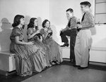 Left to right, Linda Gregory, Jocelyn Stevenson, Linda Taylor, Lloyd McKnight and Wendy Wyly. They are drinking cokes and talking.