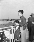 Two childen look at an airplane parked on a runway in the distance at the opening of the Greater Fort Worth International Airport. There is an unidentified man standing to the right of the children. The airport is also known as the Greater Southwest International Airport and Amon Carter Field.
