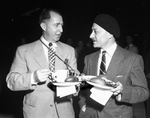 Two unidentified men at the opening of the Greater Fort Worth International Airport. Both men are holding plates with food. The man on the right is wearing a beret. The airport is also known as the Greater Southwest International Airport and Amon Carter Field.