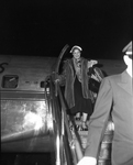 An unidentified woman walking out of an airplane wearing a dark dress and fur coat. She is holding a large purse. The woman is attending the opening of the Greater Fort Worth International Airport. The airport is also known as the Greater Southwest International Airport and Amon Carter Field.
