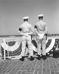 The opening of the Greater Fort Worth International Airport. Two military men, with their backs to the camera, standing on a deck are looking at the runway with an airplane in the distance. The airport is also known as the Greater Southwest International Airport and Amon Carter Field.