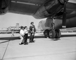 A shot of two men with a young boy and girl standing under an airplane at the opening of the Greater Fort Worth International Airport. They are looking up at the engine of the airplane. The main terminal can be seen in the background. The airport is also known as the Greater Southwest International Airport and Amon Carter Field.