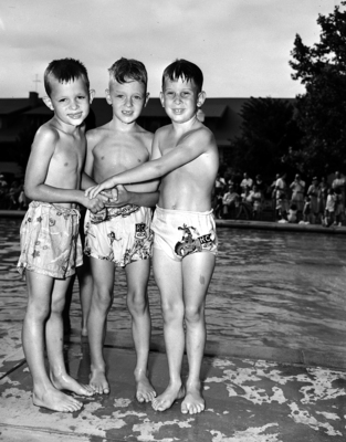 Johnny Church, right, Brent Benton, center, and Scott Gentling, left, smile after competing in the boy's 50-yard freestyle at River Crest for the city meet. Scott was first, Brent second, and Johnny third. The three boys stand next to each other in front of a pool while holding hands at the center of the group. Published in the Fort Worth Star-Telegram morning edition, July 5, 1950.