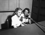 The opening of the Greater Fort Worth International Airport. Two women are sitting behind a desk. Both have a corsage with a ribbon labelled as "Hostess" pinned to their shirts. There is a microphone in front of the woman on the left. The woman on the right is holding a telephone up to her ear. The airport is also known as the Greater Southwest International Airport and Amon Carter Field.