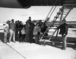 The opening of the Greater Fort Worth International Airport. A group of spectators are standing below the belly of an air plane. There is a ladder going up to the opening. The terminal is seen in the background. The airport is also known as the Greater Southwest International Airport and Amon Carter Field.