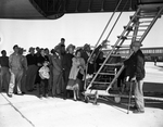 The opening of the Greater Fort Worth International Airport. A group of spectators are standing below the belly of an air plane. There is a ladder going up to the opening. The terminal is seen in the background. The airport is also known as the Greater Southwest International Airport and Amon Carter Field.