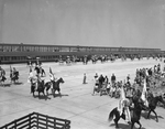The opening of the Greater Fort Worth International Airport. A group of cowboys are riding horses outside of the airport terminal. On the right is a large number of chairs with seated spectators. The airport is also known as the Greater Southwest International Airport and Amon Carter Field.