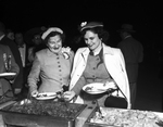 The opening of the Greater Fort Worth International Airport. A shot of two women holding plates. The woman on the right is scooping barbecue out of a large tray. There is a man to their left holding a plate. The airport is also known as the Greater Southwest International Airport and Amon Carter Field.