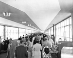 The opening of the Greater Fort Worth International Airport. A group of people walking through the terminal. The airport is also known as the Greater Southwest International Airport and Amon Carter Field.