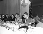 The opening of the Greater Fort Worth International Airport. A small group of people are sitting at a dining table with a flower arrangement at the event. In the foreground is a replica of an airplane on the table. The airport is also known as the Greater Southwest International Airport and Amon Carter Field.