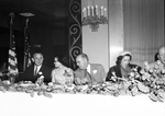 The opening of the Greater Fort Worth International Airport. A small group of people are sitting at a dining table with a flower arrangement at the event. The airport is also known as the Greater Southwest International Airport and Amon Carter Field.