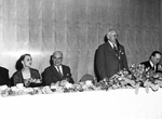 The opening of the Greater Fort Worth International Airport. A small group of people are sitting at a dining table with a flower arrangement at the event. There is a man standing and speaking into a microphone on the right side of the image. The airport is also known as the Greater Southwest International Airport and Amon Carter Field.