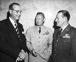 The opening of the Greater Fort Worth International Airport. Three men are standing and conversing at the event. The man in the center and on the right are wearing military uniforms. The airport is also known as the Greater Southwest International Airport and Amon Carter Field.