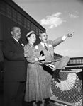 The opening of the Greater Fort Worth International Airport. Two men and a woman are standing outside of the terminal at the event. The man on the right is raising his left leg and arm to point towards the sky. The woman is holding a purse and papers. The airport is also known as the Greater Southwest International Airport and Amon Carter Field.