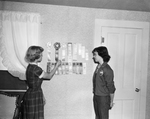 Regina shows a friend, Sharon Brown, show ribbons won with the beef calves which Regina fed as 4-H projects.