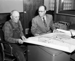 Jess Dewees, left, chairman of the Upper Washita Soil Conservation District, looks at a Washita map with L. L. Male, Cheyenne, Oklahoma, banker. Both believe the small dam project on the Sandstone will serve their purpose completely.