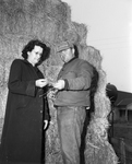 Mr. and Mrs. Roy Baker look at some of the fine hay they have left over on their farm near Elk City, Oklahoma, as winter ends. Baker made a hay crop as a result of seepage from a detention reservoir on the farm.